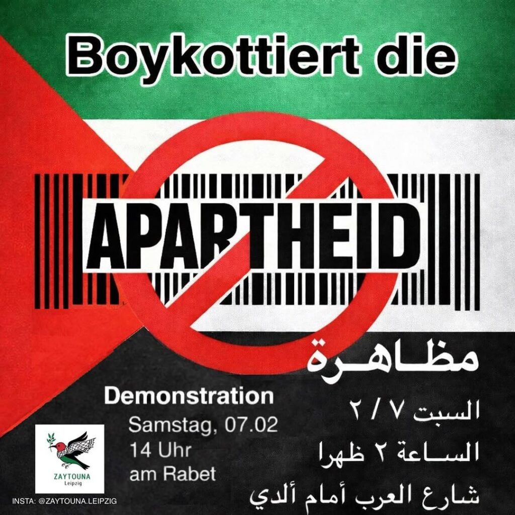 Kategorie: General Demonstration - Boykottiert die Apartheid - am Rabet 14:00 7. Februar 2026 LeipzigVeranstaltungsort anschauen Kompletten Kalender ansehen
