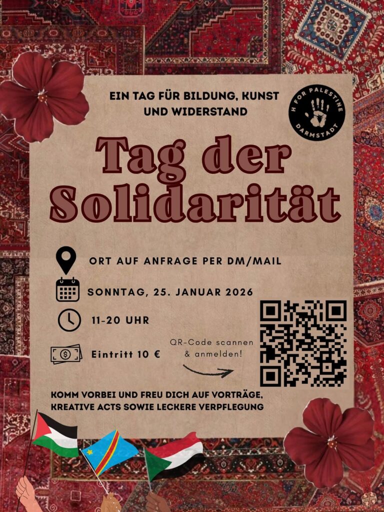 Kategorie: General Tag der Solidarität - Ein Tag für Bildung, Kunst und Widerstand 11:00 – 20:0025. Januar 2026 DarmstadtVeranstaltungsort anschauen Kompletten Kalender ansehen