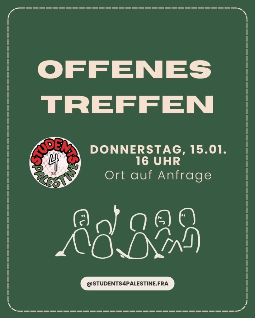 Veranstaltungskalender Kategorie: General Offenes Treffen - Students 4 Palestine - Ort auf Anfrage 16:00 15. Januar 2026 Frankfurt / MVeranstaltungsort anschauen Kompletten Kalender ansehen