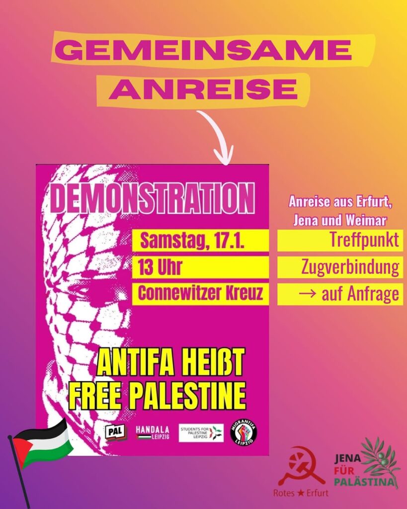 Kategorie: General Gemeinsame Anreise - Demonstration - Antifa heißt Free Palestine 13:00 – 14:0017. Januar 2026 Jena, Weimar und ErfurtVeranstaltungsort anschauen Kompletten Kalender ansehen