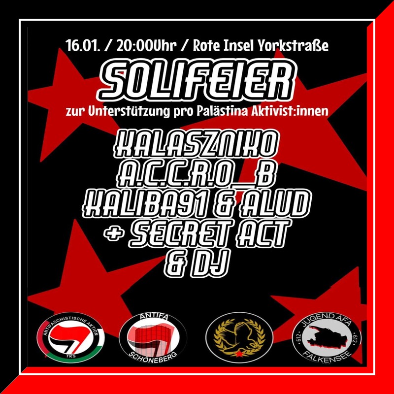 Veranstaltungskalender Kategorie: General Solifeier zur Unterstützung pro Palästina Aktivist:innen 20:00 16. Januar 2026 BerlinVeranstaltungsort anschauen Kompletten Kalender ansehen