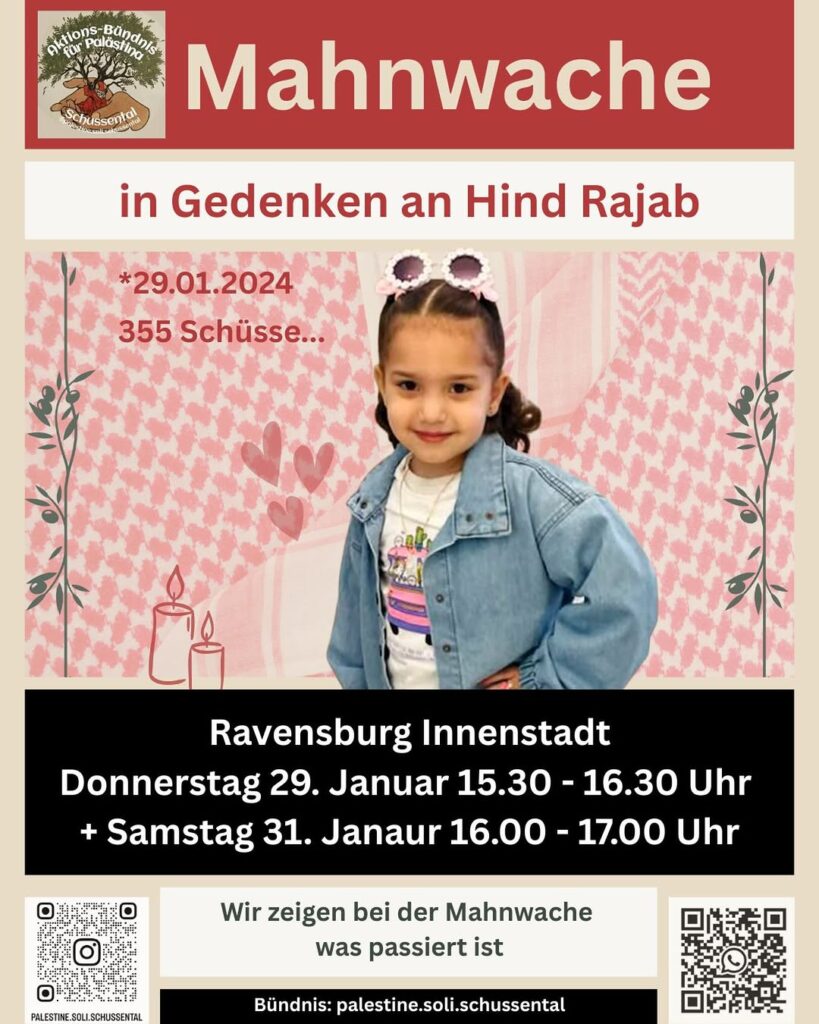 Kategorie: General Mahnwache in Gedenken an Hind Rajab - Ravensburg Innenstadt 16:00 – 17:0031. Januar 2026 RavensburgVeranstaltungsort anschauen Kompletten Kalender ansehen