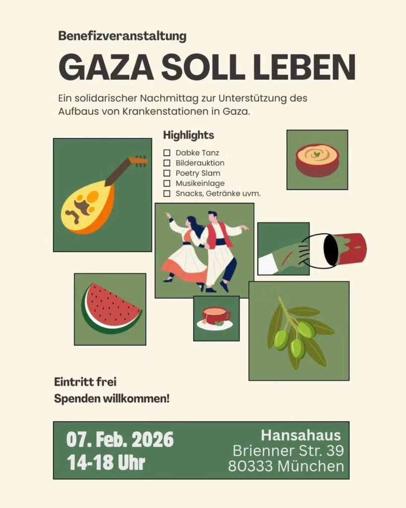 Kategorie: General Benefizveranstaltung - Gaza soll leben - Ein solidarischer Nachmittag 14:00 – 18:007. Februar 2026 MünchenVeranstaltungsort anschauen Kompletten Kalender ansehen