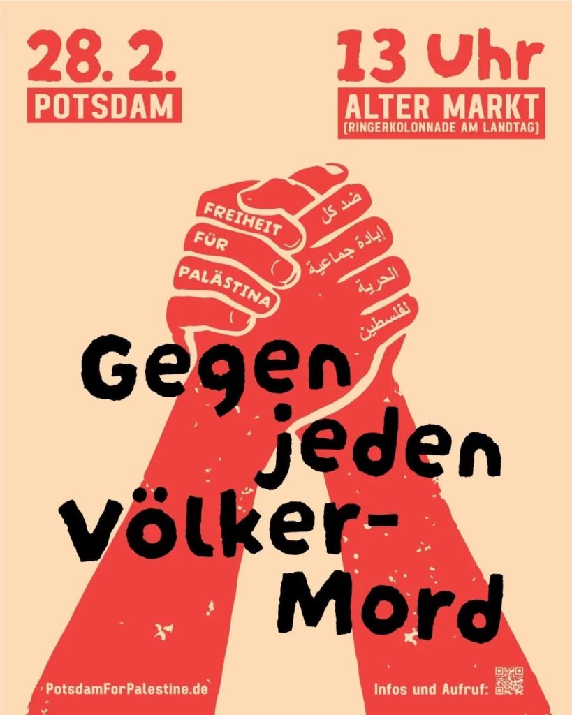 Veranstaltungskalender Kategorie: General Demo: Freiheit für Palästina – Gegen jeden Völkermord! 13:00 28. Februar 2026 PotsdamVeranstaltungsort anschauen Kompletten Kalender ansehen