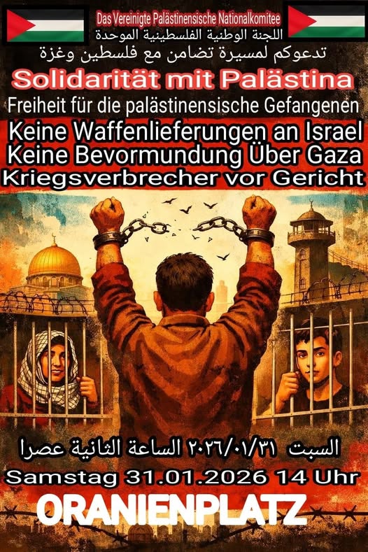 Kategorie: General Solidarität mit Palästina - Freiheit für die palästinensischen Gefangenen 14:00 31. Januar 2026 BerlinVeranstaltungsort anschauen Kompletten Kalender ansehen