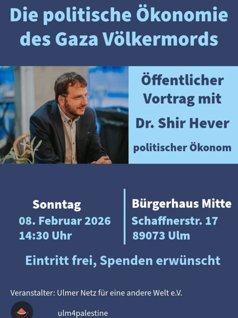 Kategorie: General Vortrag mit Shir Hever - Die politische Ökonomie des Gaza Völkermords 14:30 8. Februar 2026 UlmVeranstaltungsort anschauen Kompletten Kalender ansehen