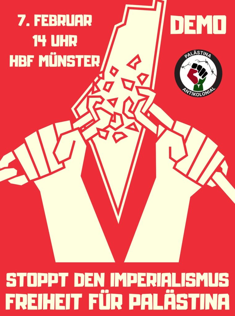 Veranstaltungskalender Kategorie: General Demo - Stoppt den Imperialismus - Freiheit für Palästina 14:00 7. Februar 2026 MünsterVeranstaltungsort anschauen Kompletten Kalender ansehen
