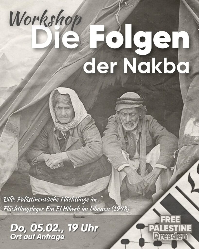 Kategorie: General Workshop - Die Folgen der Nakba - Free Palestine Dresden 19:00 5. Februar 2026 DresdenVeranstaltungsort anschauen Kompletten Kalender ansehen