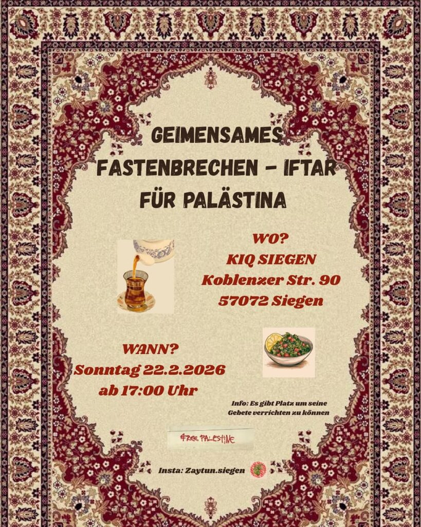 Kategorie: General Gemeinsames Fastenbrechen - IFTAR für Palästina 17:00 22. Februar 2026 SiegenVeranstaltungsort anschauen Kompletten Kalender ansehen