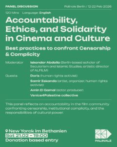 Within the context of dark and challenging historical moment that we are living in, how can we reflect on what accountability can look like for the film community? And how is that applied more broadly to other areas of culture? By confronting censorship, exposing institutional complicity, and reflecting on the responsibilities that come with cultural power this panel will engage you in what is sure to be important discussion for any film festival.