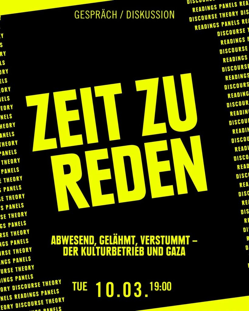 Kategorie: General Gespräch und Diskussion - Zeit zu reden - Abwesend, gelähmt, verstummt - Der Kulturbetrieb und Gaza 19:00 10. März 2026 HamburgVeranstaltungsort anschauen Kompletten Kalender ansehen