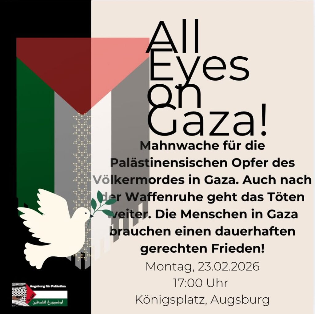 Kategorie: General All eyes on Gaza! Mahnwache für die palästinensischen Opfer des Völkermordes in Gaza 17:00 23. Februar 2026 AugsburgVeranstaltungsort anschauen Kompletten Kalender ansehen