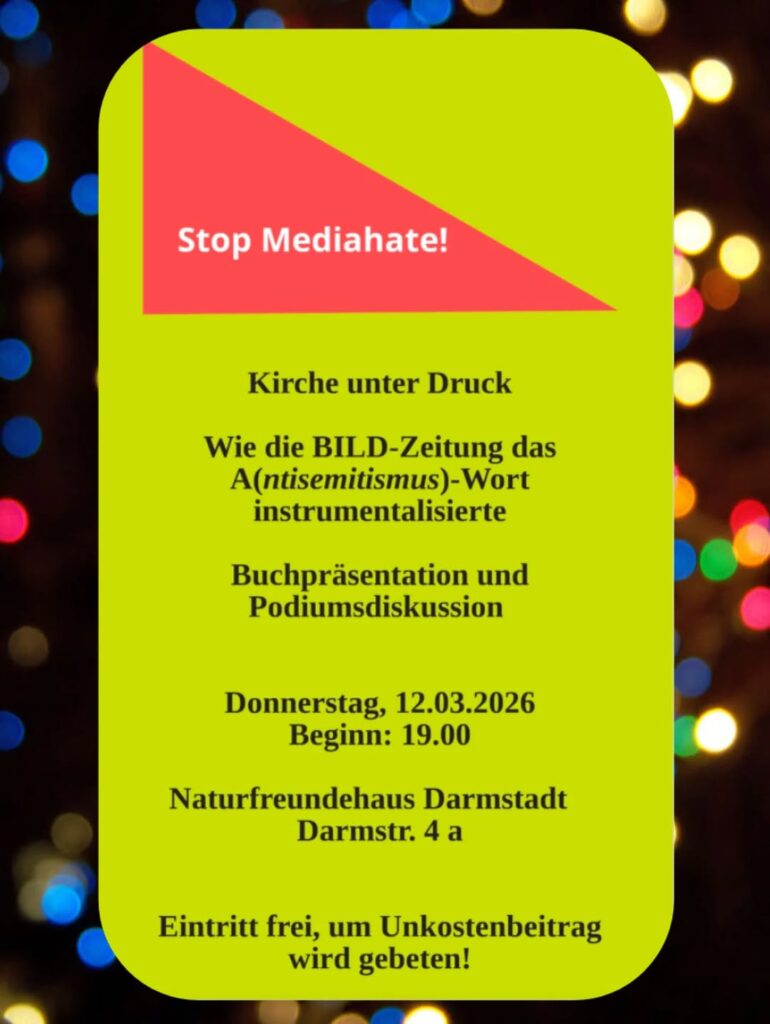 Kategorie: General Buchpräsentation und Podiumsdiskussion - Stop Mediahate! 19:00 12. März 2026 DarmstadtVeranstaltungsort anschauen Kompletten Kalender ansehen