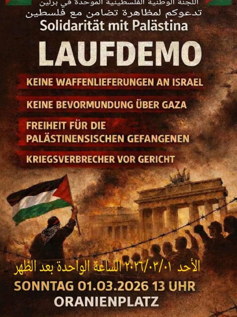 Solidarität mit Palästina - Keine Waffenlieferungen an Israel - Keine Bevormundung über Gaza - Freiheit für die palästinensischen Gefangenen - Kriegsverbrecher vor Gericht