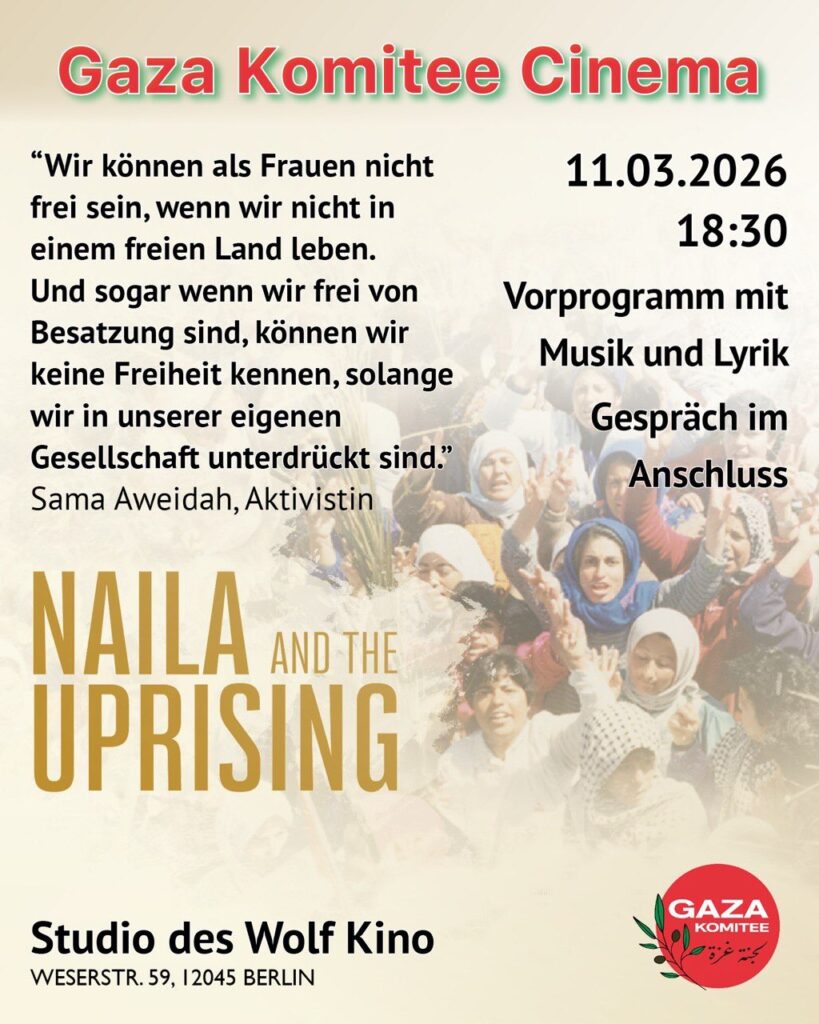 Kategorie: General Gaza Komitee Cinema - Naila and the Uprising 18:30 11. März 2026 BerlinVeranstaltungsort anschauen Kompletten Kalender ansehen