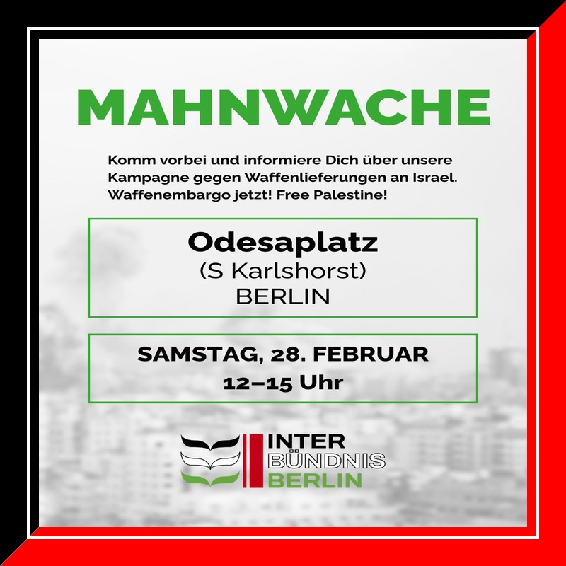 Veranstaltungskalender Kategorie: General Mahnwache - Komm vorbei und informiere Dich über unsere Kampagne gegen Waffenlieferungen an Israel. 12:00 – 15:0028. Februar 2026 BerlinVeranstaltungsort anschauen Kompletten Kalender ansehen