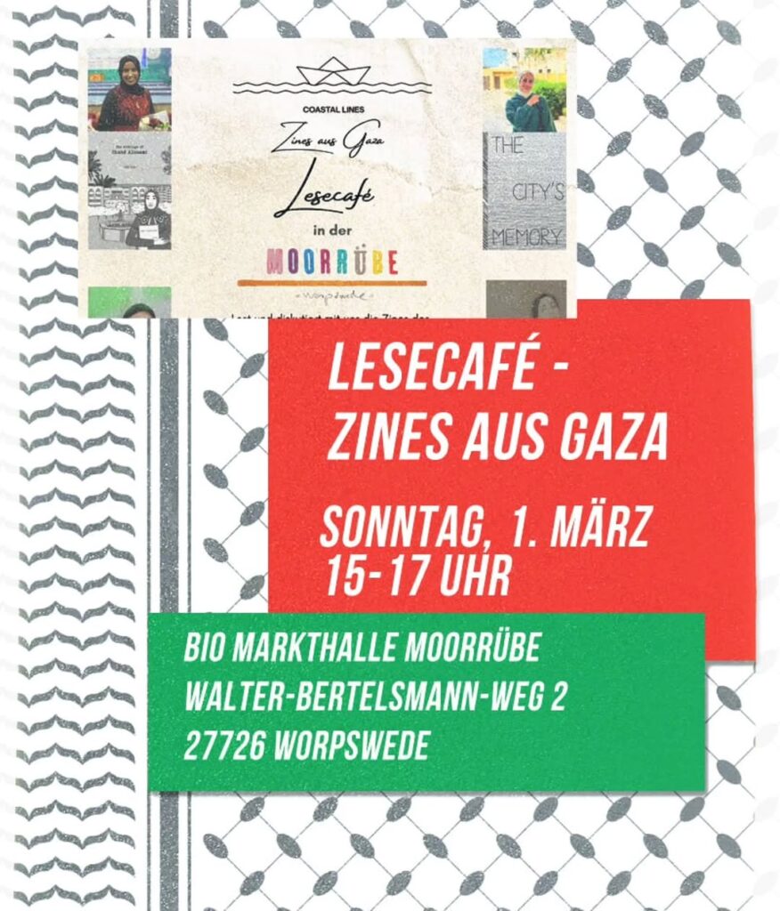 Kategorie: General Lesecafé - Zines aus Gaza - Bio Markthalle Moorrübe 15:00 – 17:001. März 2026 WorpswedeVeranstaltungsort anschauen Kompletten Kalender ansehen