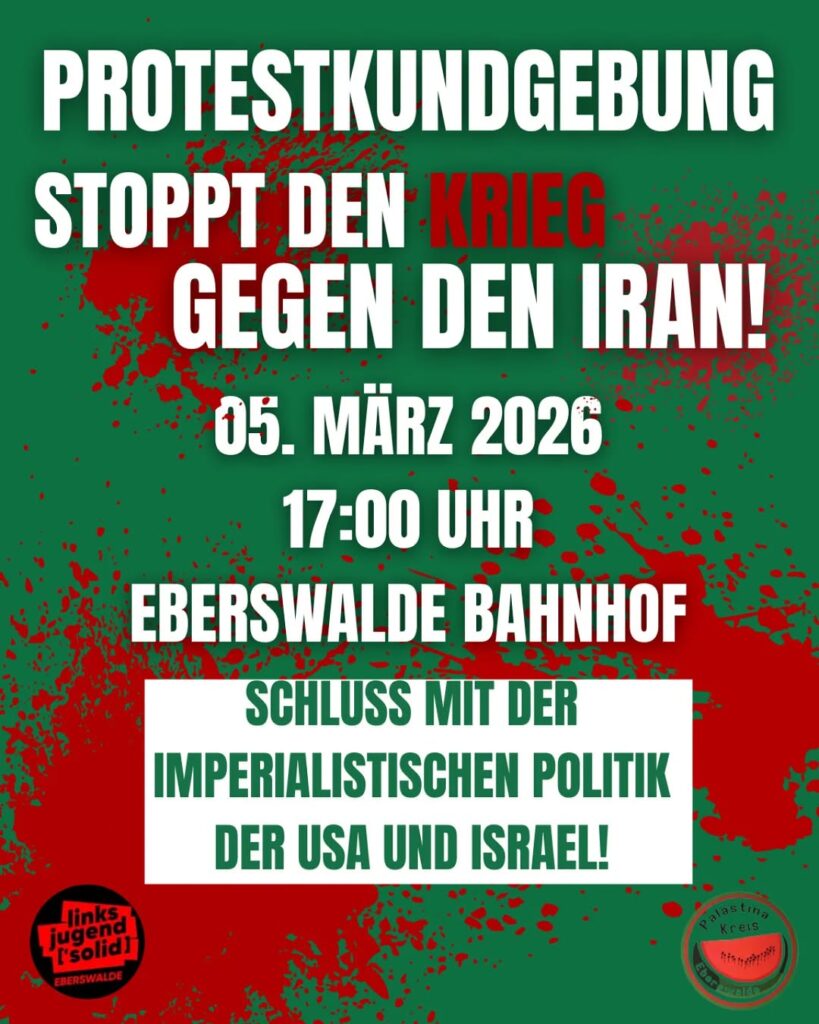 Kategorie: General Protestkundgebung - Stoppt den Krieg gegen den Iran! 17:00 5. März 2026 EberswaldeVeranstaltungsort anschauen Kompletten Kalender ansehen