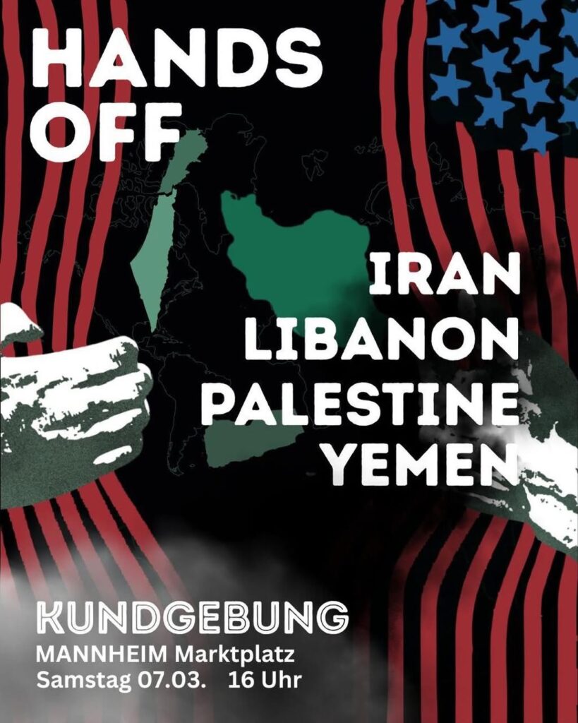 Kategorie: General Kundgebung - Hands off Iran, Libanon, Palestine, Yemen 16:00 7. März 2026 MannheimVeranstaltungsort anschauen Kompletten Kalender ansehen