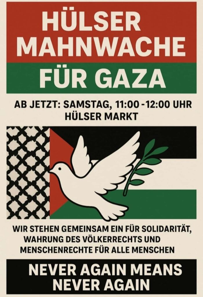 Kategorie: General JEDEN SAMSTAG HÜLSER MAHNWACHE FÜR GAZA 11:00 – 12:0014. März 2026 Jeden Samstag von 11 bis 12 Uhr auf dem Hülser Markt in Krefeld-Hüls. Krefeld-HülsVeranstaltungsort anschauen Kompletten Kalender ansehen