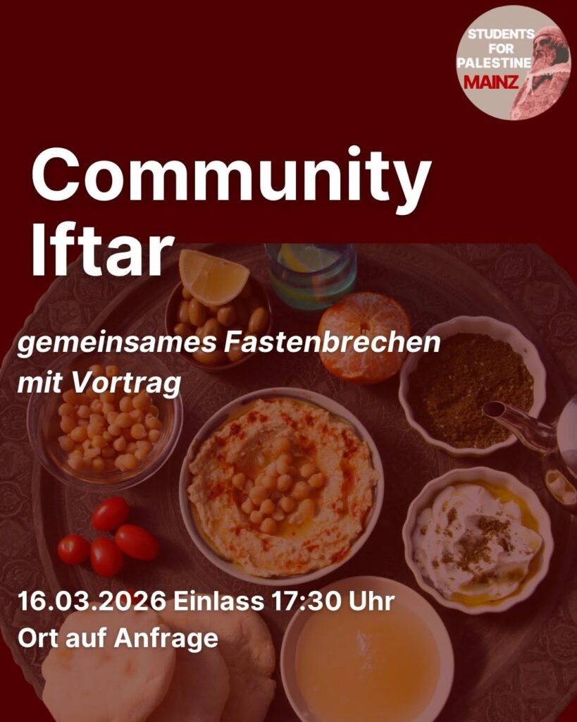 Veranstaltungskalender Kategorie: General Community Iftar - gemeinsames Fastenbrechen mit Vortrag 17:30 16. März 2026 MainzVeranstaltungsort anschauen Kompletten Kalender ansehen
