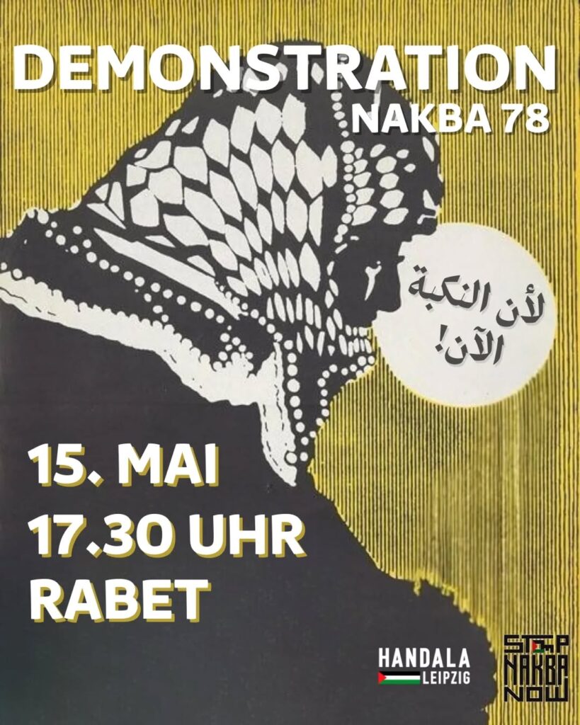 Veranstaltungskalender Kategorie: General Demonstration NAKBA 78 - Rabet - Handala Leipzig 17:30 15. Mai 2026 LeipzigVeranstaltungsort anschauen Kompletten Kalender ansehen
