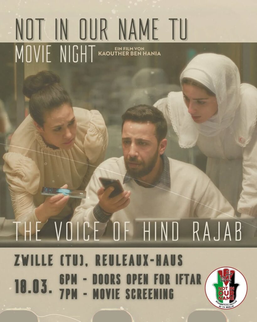 Kategorie: General Not in our name TU - Movie Night - The voice of Hind Rajab 18:00 18. März 2026 BerlinVeranstaltungsort anschauen Kompletten Kalender ansehen