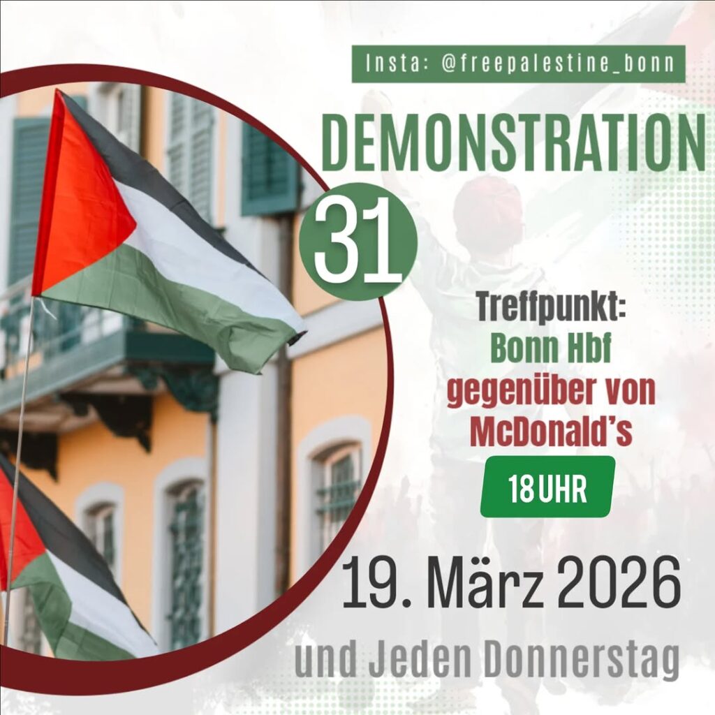 Veranstaltungskalender Kategorie: General Demonstration #31 - Treffpunkt: Bonn Hbf gegenüber von McDonald's 18:00 19. März 2026 BonnVeranstaltungsort anschauen Kompletten Kalender ansehen