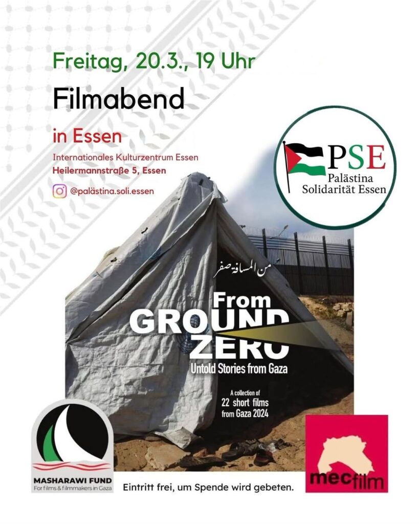 Kategorie: General Filmabend - From Ground Zero - Untold Stories from Gaza 19:00 20. März 2026 EssenVeranstaltungsort anschauen Kompletten Kalender ansehen