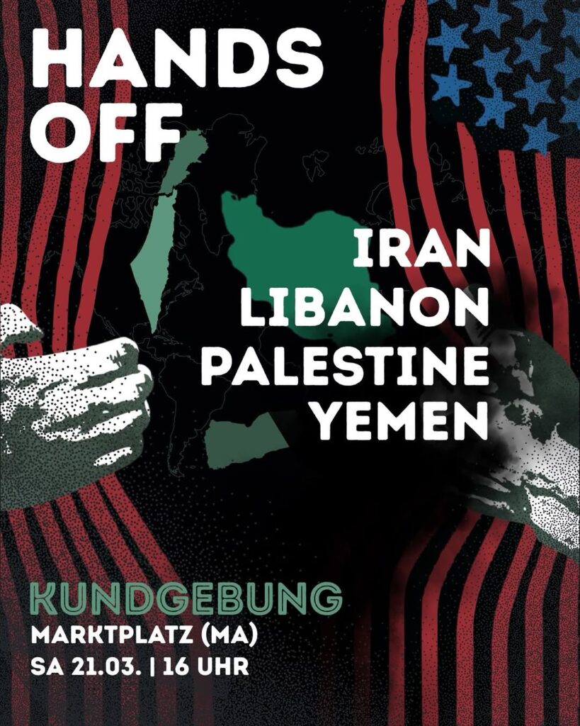 Kategorie: General Kundgebung - Hands off Iran, Libanon, Palestine, Jemen 16:00 21. März 2026 MannheimVeranstaltungsort anschauen Kompletten Kalender ansehen