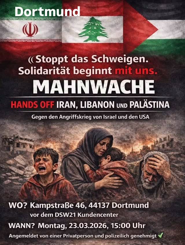 Kategorie: General Mahnwache - Stoppt das Schweigen- Solidarität beginnt mit uns 15:00 23. März 2026 DortmundVeranstaltungsort anschauen Kompletten Kalender ansehen