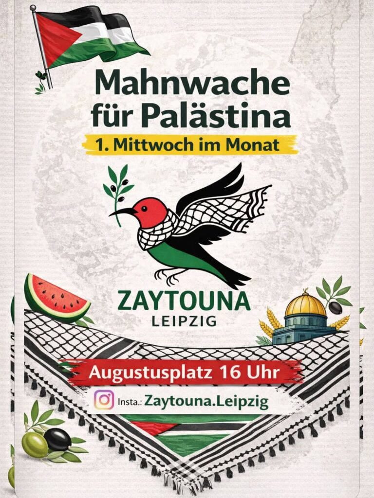 Kategorie: General Mahnwache für Palästina - jeden 1. Mittwoch im Monat 16:00 1. April 2026 LeipzigVeranstaltungsort anschauen Kompletten Kalender ansehen