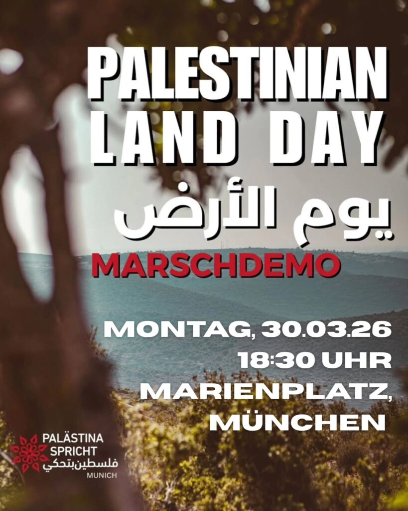 Kategorie: General Marschdemo - Palestinian Land Day - Marienplatz 18:30 30. März 2026 MünchenVeranstaltungsort anschauen Kompletten Kalender ansehen