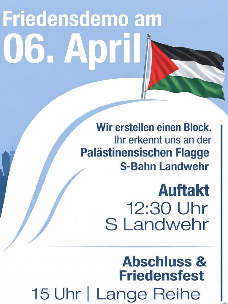 Kategorie: General Friedensdemo - Wir erstellen einen Block, siehe Palästina Flagge 12:30 6. April 2026 HamburgVeranstaltungsort anschauen Kompletten Kalender ansehen