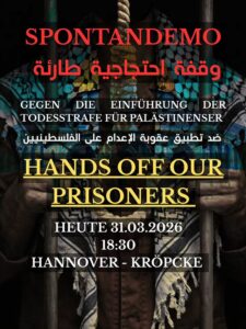 ضد تطبيق قانون إعدام الأسرى الفلسطينيين، وضد هذا الاحتلال وكل ما يقوم به لمحو الحق الفلسطيني.اليوم الثلاثاء الموافق 31.3.2026 في كروبكه- هانوفر.