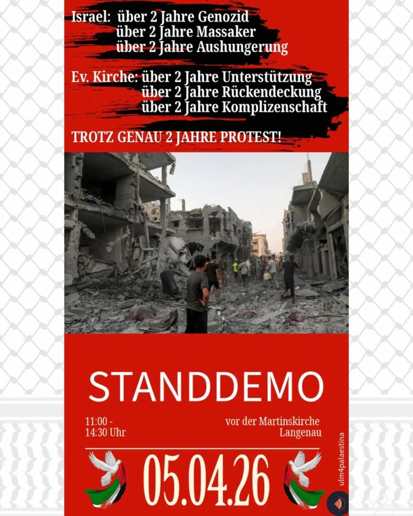 Kategorie: General Standdemo - Israel: über 2 Jahre Genozid, Massaker, Aushungern 11:00 – 14:305. April 2026 UlmVeranstaltungsort anschauen Kompletten Kalender ansehen