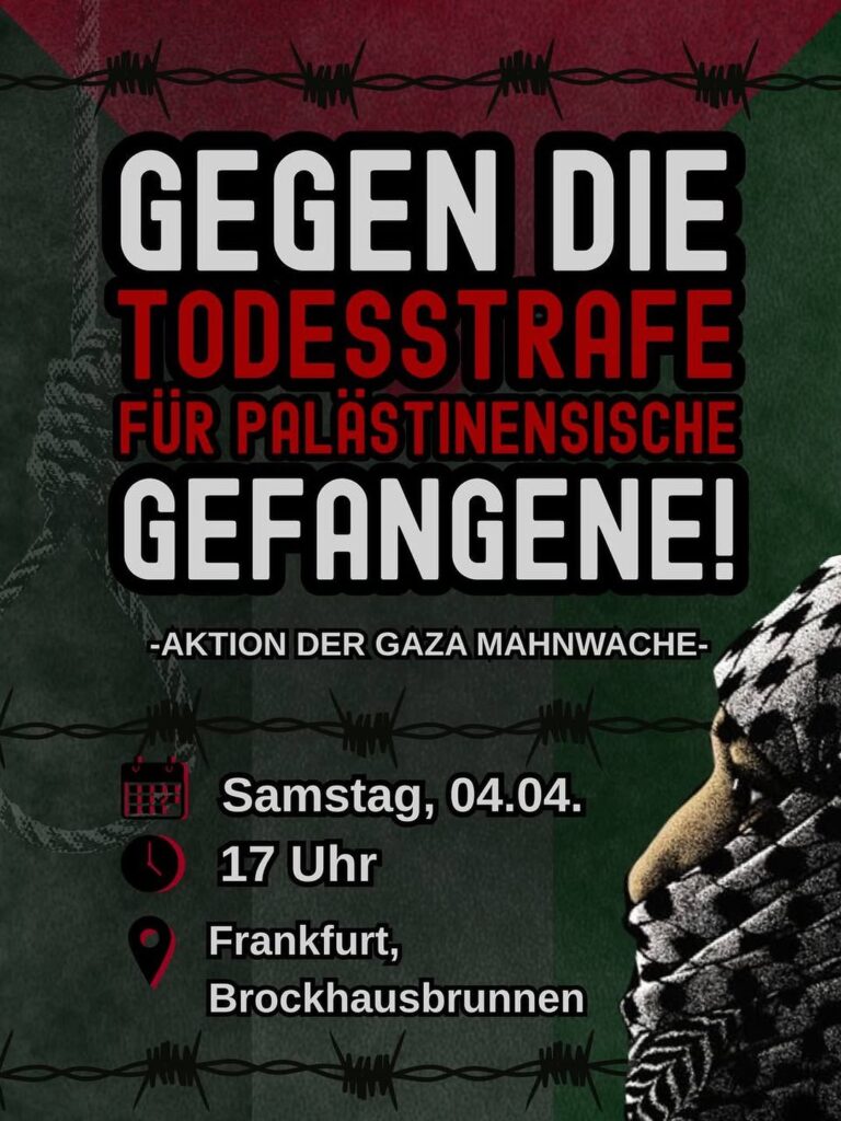 Kategorie: General Aktion der Gaza Mahnwache - Gegen die Todesstrafe für palästinensische Gefangene! 17:00 4. April 2026 Frankfurt / MVeranstaltungsort anschauen Kompletten Kalender ansehen