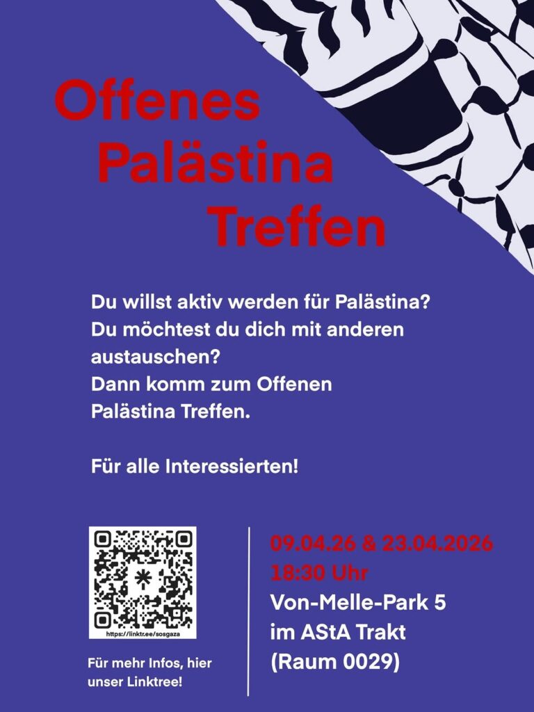 Veranstaltungskalender Kategorie: General Offenes Palästina Treffen - Für alle Interessierten! 18:30 23. April 2026 HamburgVeranstaltungsort anschauen Kompletten Kalender ansehen