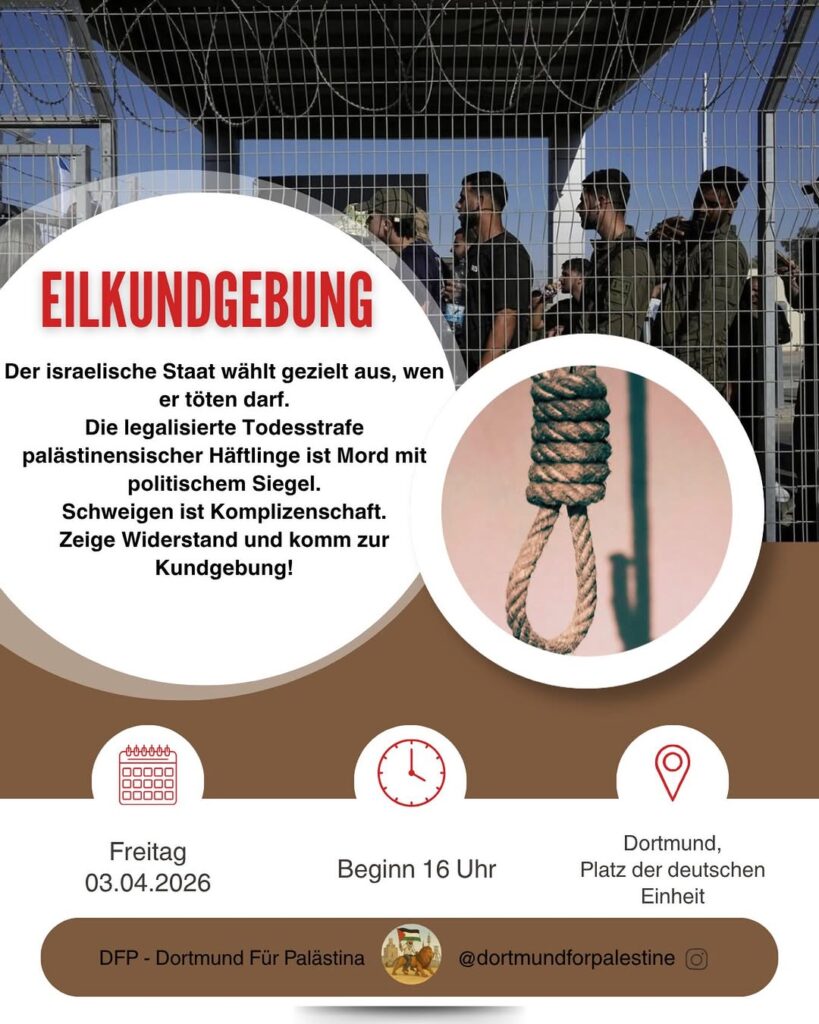 Kategorie: General Eilkundgebung gegen die Einführung der Todesstrafe in Israel 16:00 3. April 2026 DortmundDortmund, Veranstaltungsort anschauen Kompletten Kalender ansehen