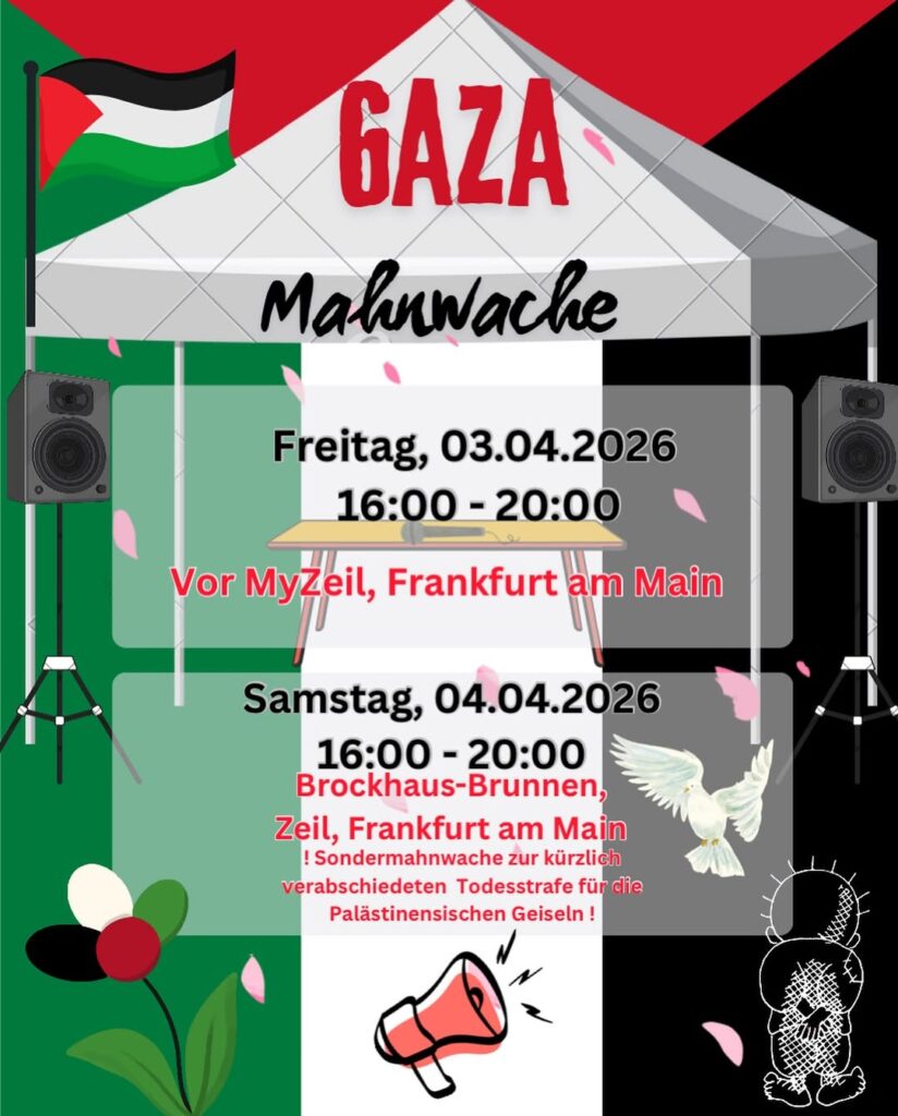 Veranstaltungskalender Kategorie: General Sondermahnwache zur kürzlich verabschiedeten Todestrafe für die palästinensischen Geiseln 16:00 – 20:004. April 2026 Frankfurt / MVeranstaltungsort anschauen Kompletten Kalender ansehen