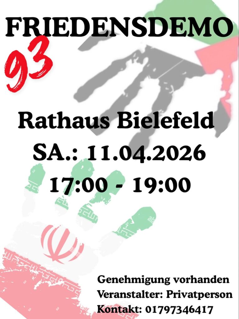 Kategorie: General Friedensdemo 93 - Rathaus Bielefeld - Genehmigung vorhanden 17:00 – 19:0011. April 2026 BielefeldVeranstaltungsort anschauen Kompletten Kalender ansehen