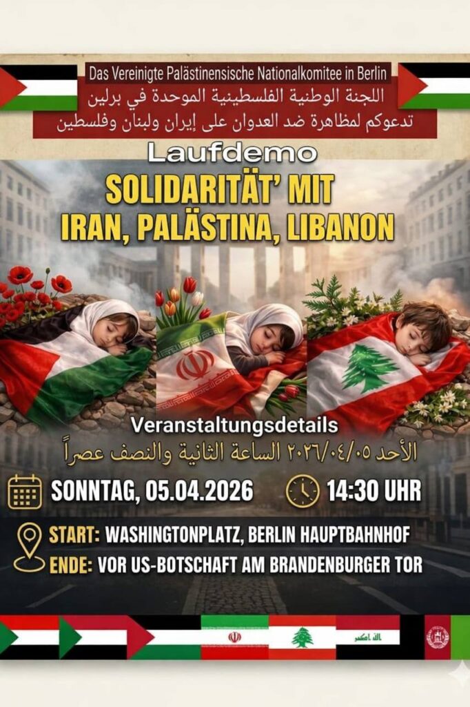 Kategorie: General STOPPT DIE US-ISRAELISCHE AGGRESSION! HÄNDE WEG VOM IRAN, PALÄSTINA, LIBANON! 14:30 5. April 2026 BerlinVeranstaltungsort anschauen Kompletten Kalender ansehen