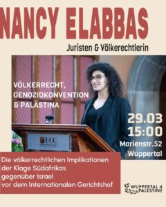 Die Völkerrechtlerin und Juristin Nancy Elabbas hält ihren Vortrag über die völkerrechtlichen Implikationen der Klage Südafrikas gegen Israel vor dem internationalen Gerichtshof (IHG).
