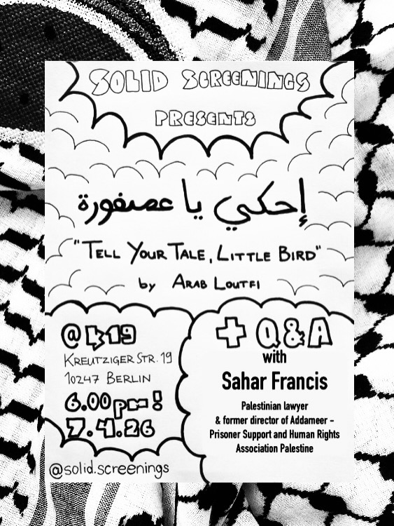Kategorie: General Film Screening 'Tell Your Tale, Little Bird' by Arab Loutfi + Q&A with Sahar Francis 18:00 7. April 2026 BerlinVeranstaltungsort anschauen Kompletten Kalender ansehen