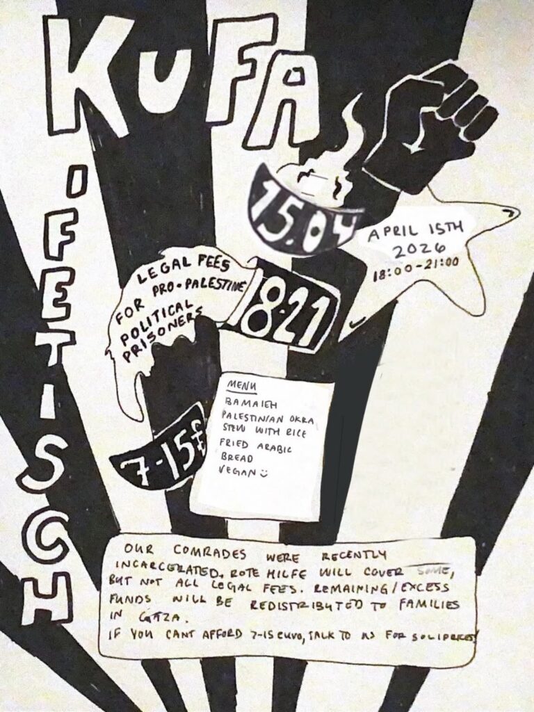 Veranstaltungskalender Kategorie: General KUFA - Legal Fees for Pro-Palestine Political Prisoners 18:00 – 21:0015. April 2026 BerlinVeranstaltungsort anschauen Kompletten Kalender ansehen