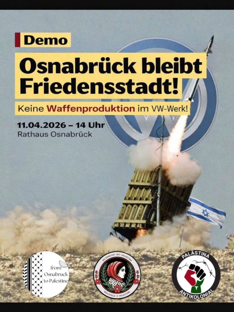 Veranstaltungskalender Kategorie: General Demo - Osnabrück bleibt Friedensstadt! Keine Waffenproduktion im VW-Werk! 14:00 11. April 2026 OsnabrückVeranstaltungsort anschauen Kompletten Kalender ansehen