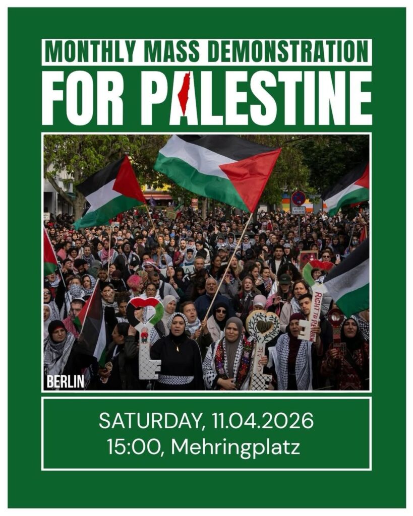 Veranstaltungskalender Kategorie: General Monthly Mass Demonstration for Palestine 15:00 11. April 2026 BerlinVeranstaltungsort anschauen Kompletten Kalender ansehen