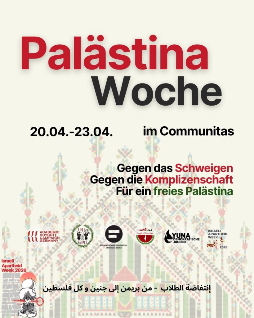 Kategorie: General Palästina Woche - Gegen das Schweigen - Gegen die Komplizenschaft - Für ein freies Palästina 14:00 21. April 2026 BremenVeranstaltungsort anschauen Kompletten Kalender ansehen