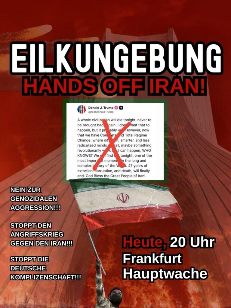 Kategorie: General Eilkundgebung - Hands off Iran! - Nein zur genozidalen Aggression!!! 20:00 7. April 2026 Frankfurt / MVeranstaltungsort anschauen Kompletten Kalender ansehen