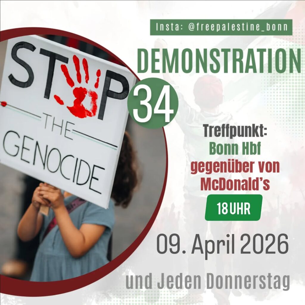 Veranstaltungskalender Kategorie: General Demonstration #34 - Treffpunkt: Bonn Hbf gegenüber von McDonald's 18:00 9. April 2026 BonnVeranstaltungsort anschauen Kompletten Kalender ansehen